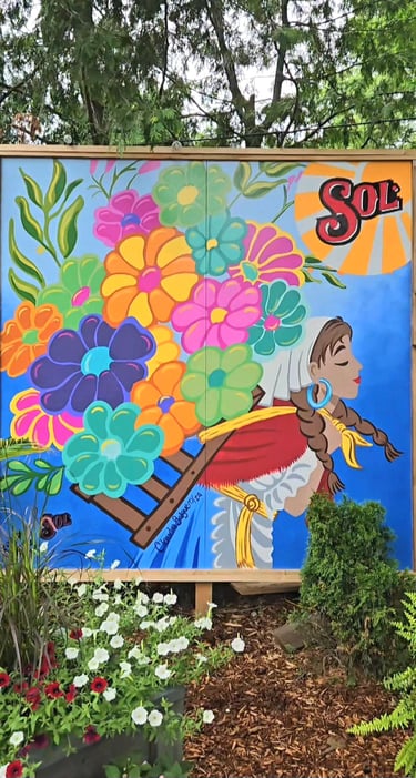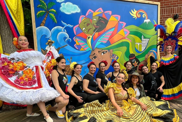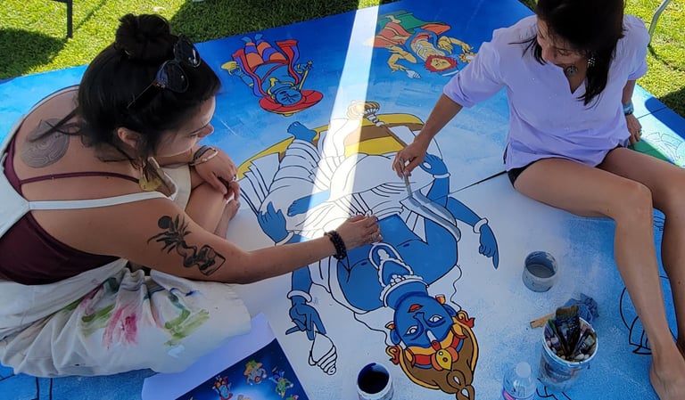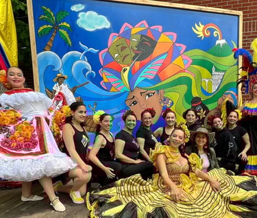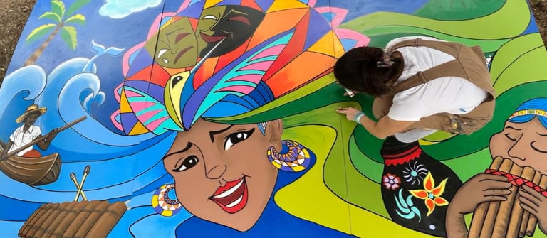 In the last couple of years I have had the honour to be commissioned for the creation of two community murals by “Heritage colombien”, a cultural organisation dedicated to the promotion of Latin American culture through dance. In 2023 the mural was dedicated to the “Carnaval de Negros y Blancos” (the Blacks and Whites Carnival) that takes place every January in Pasto, Colombia and which since 2009 is part of UNESCO’s World Cultural Heritage. In 2024 the mural was dedicated to the “Feria de las Flores” (Festival of Flowers) that takes place every August in Medellin, Colombia.