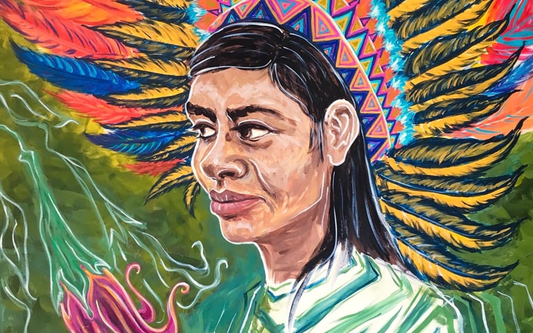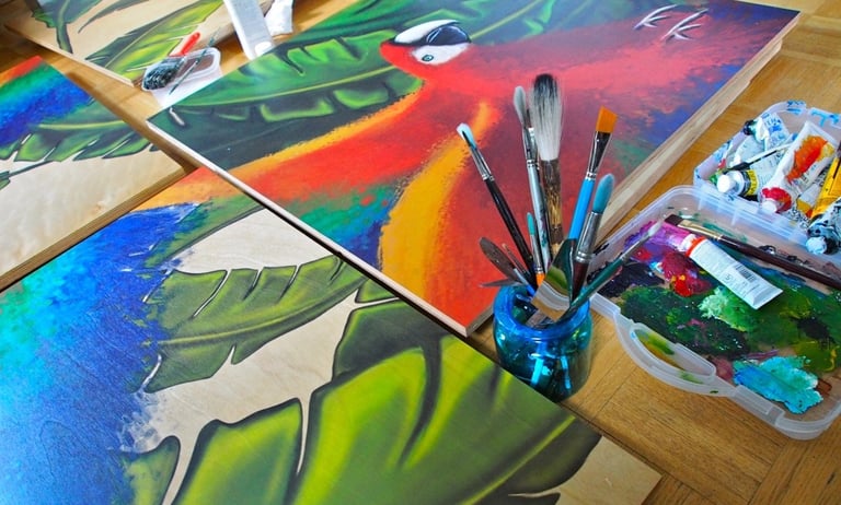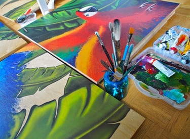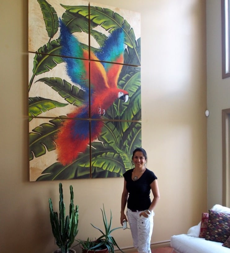 This 8x12 feet mural was a pleasure to create. Inspired by the colours and fauna of the tropical forest I created Guacamaya using digital brushes and acrylics. The bird was printed on six 4x4 wooden panels and finalized with acrylics.