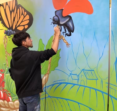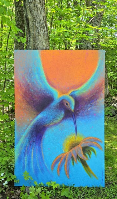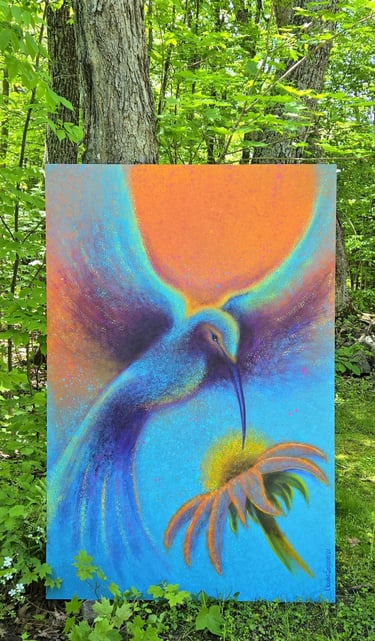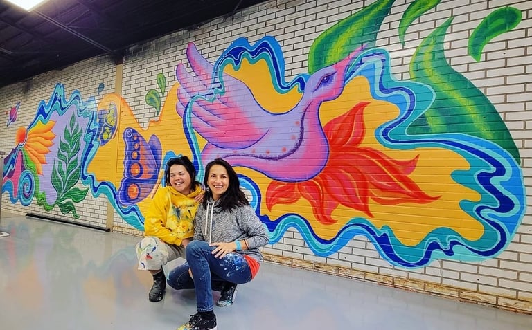 Deb who has Indigenous background, shared with me that in traditional knowledge, hummingbirds are messengers of hope, joy, and love, and are believed to carry the wishes of the people to the spirit world. She commissioned this mural for her beautifully kept garden.