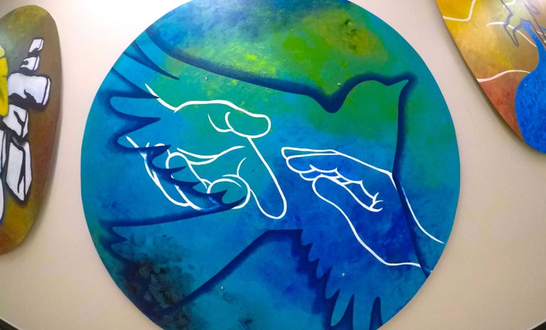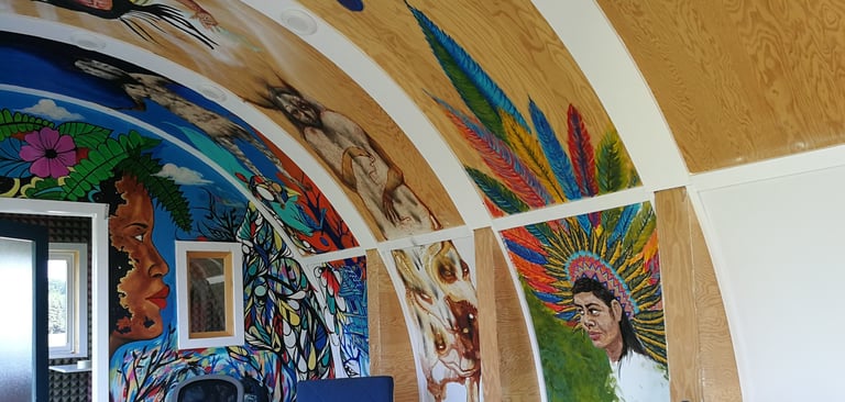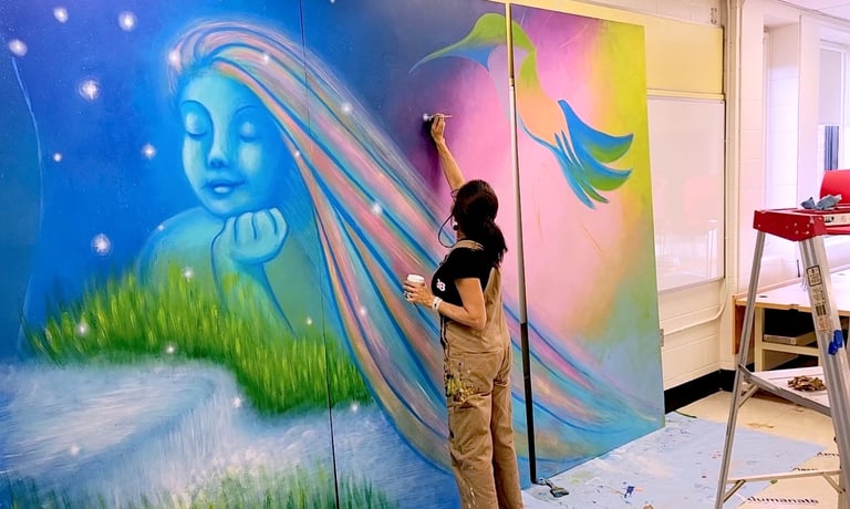 In this mural commissioned by and located at the School of Social Work at the University of Ottawa. I wanted to convey what I believe a Social Worker represents: A sense of universal connection, embracing of diversity, freedom and trust, support, open mind, and the certainty that we are one as a species and one with nature.