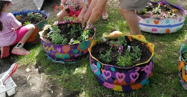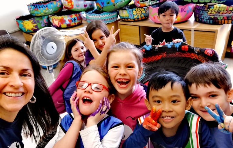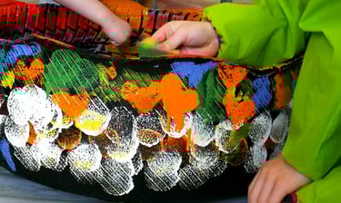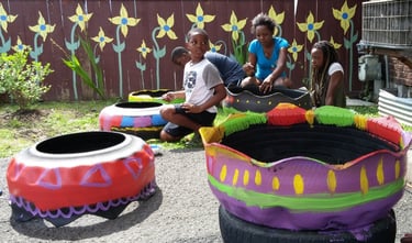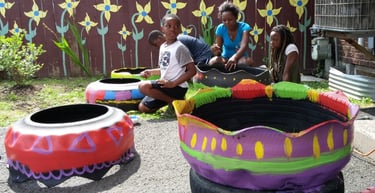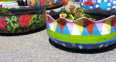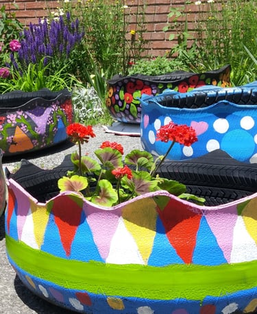 In this community workshop I lead participants to recycle used tires into colourful planters. This is a great team project that embellishes our homes and neighbourhoods while creating a community bond through art.