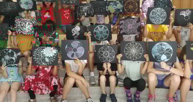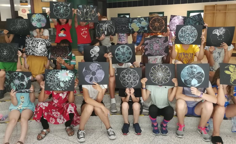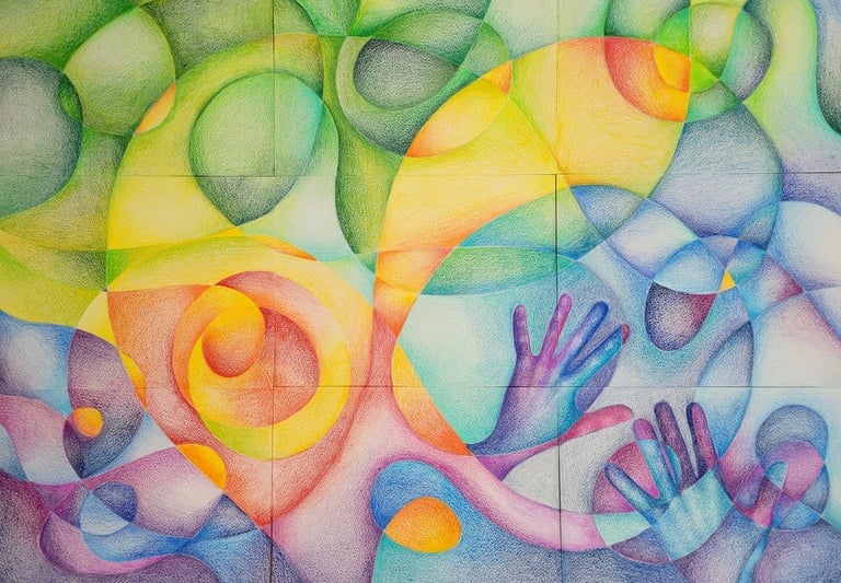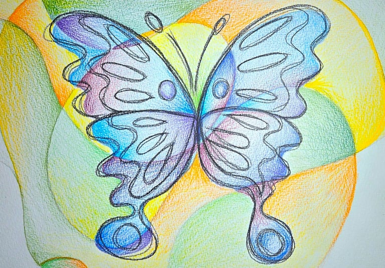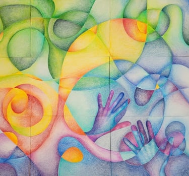 In these workshops delivered in-person or on-line the participants learn how to create unique, personal, and colourful fluid drawings using colouring pencils. I teach them how to blend and combine colours while discussing colour theory and the meaning of colour. Since each design will be unique to each participant, I guide them through the decision making so they feel confident and proud of their own creation.
